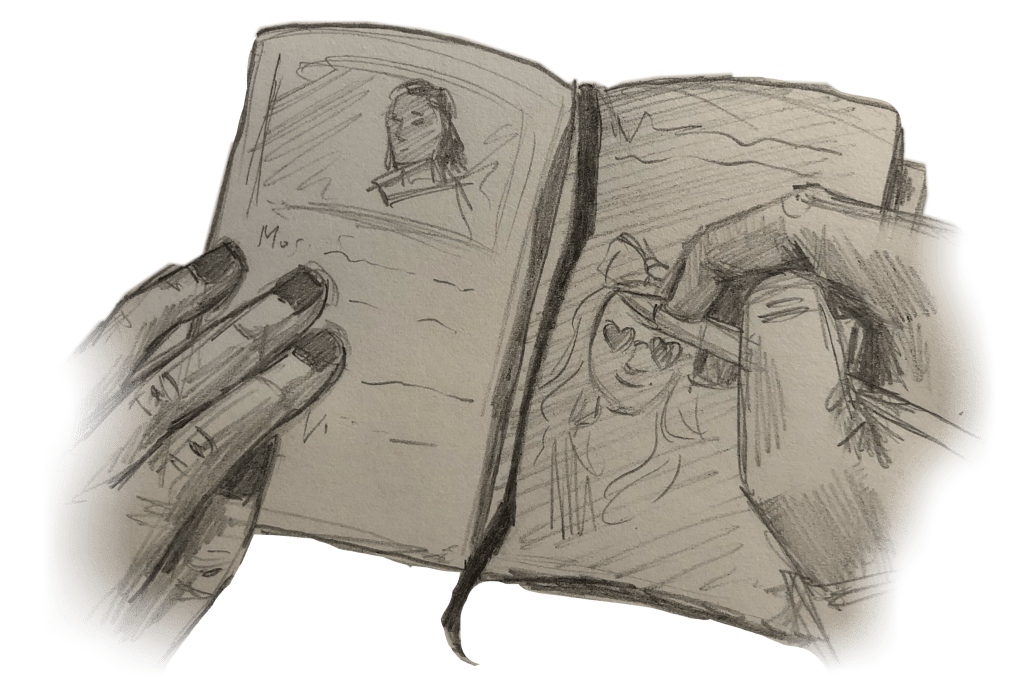 Maybe I’ll see the little girl again some day, and she’ll hide behind the columns and giggle, and I’ll duck my head, read some lines, and look up. I won’t try to sketch her again. Life is quick, unstoppable. I don’t have the skill required to copy it into a notebook scarcely the size of my hand.